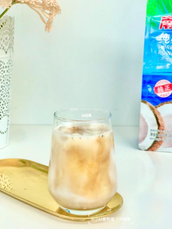 ?手残党也是零压力!倒入椰粉冲制成纯椰奶,加点咖啡粉制成咖啡液,直接冲开!喜欢冰拿铁就再来点冰块。口感也是非常奈斯的,清清凉凉的很解暑!