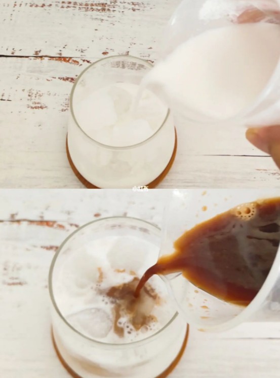 2:拿出一个杯子倒上冰块,再把椰奶和黑咖啡依次倒进杯子里就完成啦。