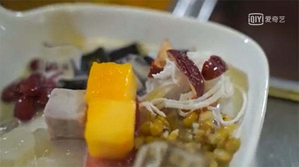 椰奶清补凉,顾名思义是以椰奶作为基础,再辅以包括空心粉、西瓜块、绿豆、芋圆、凉粉、鹌鹑蛋等食材为佐料。最后,必不可少的是加入少许冰块在其中。