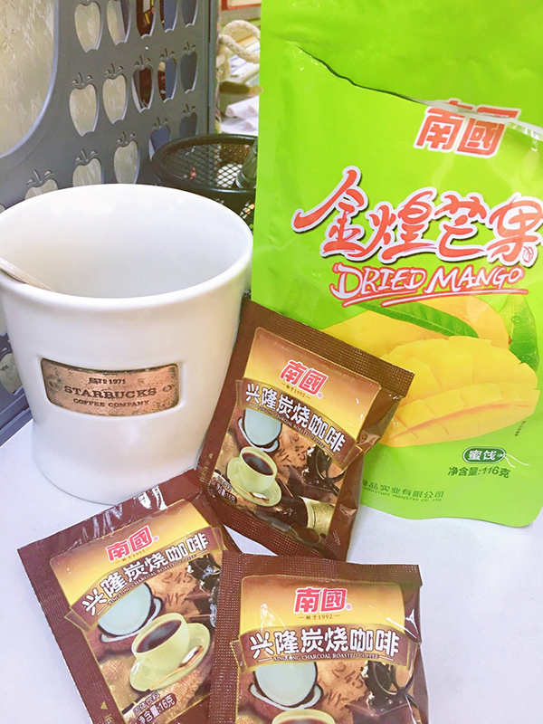 还有乱入的下午茶:海南兴隆炭烧咖啡+芒果干,疲惫的工作日下午,没有点下午茶就不够完整了,点外卖又有点小贵,自己准备点简单的吧,一般都是冲杯咖啡,尤其是滚烫的热水冲泡过来,喝上一杯瞬间解除疲惫。