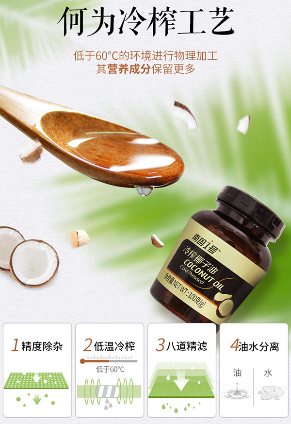 仔细对比过各品牌椰子油的小伙伴,会发现都是冷榨工艺,没啥差别,那么关键就看生产过程中的控温了,只有控制在60℃以下冷榨椰子油,其营养成分才会在zui大程度保留!