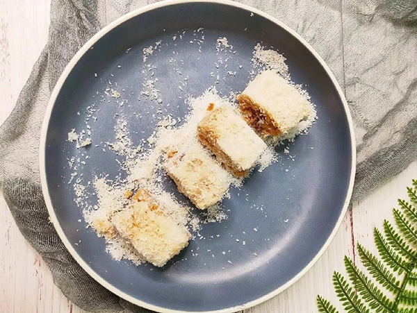 5. 撒上一些椰蓉在上面脱模,切成小方块,再撒上椰蓉就可以享用美味啦。