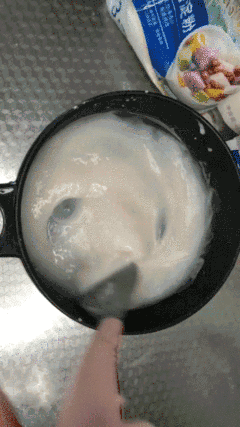 1. 在锅中加入煮好的椰奶白糖和木薯淀粉,开小火前不停搅拌均匀,成顺滑细腻的面糊状。