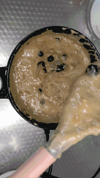 3. 一定要记得!!先在模具上抹上椰子油或者用保鲜膜铺好底,倒入模具后用勺子将上面均匀的抚平,把容器颠一下振出多余的起泡,再倒入珍珠奶茶糊糊,铺平震出气泡。