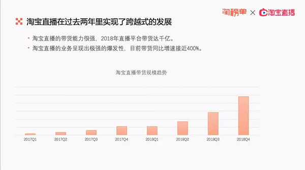 据淘榜单联合淘宝直播发布的《2019年淘宝直播生态发展趋势报告》指出,淘宝直播已经发展成为电商在新时代的新产业,随着商家、主播、消费者全方位拥抱淘宝直播,内外部发展条件成熟,淘宝直播市场将持续爆发。数据显示,2018年淘宝直播平台带货超千亿,同比增速近400%,创造了一个全新的千亿级增量市场。