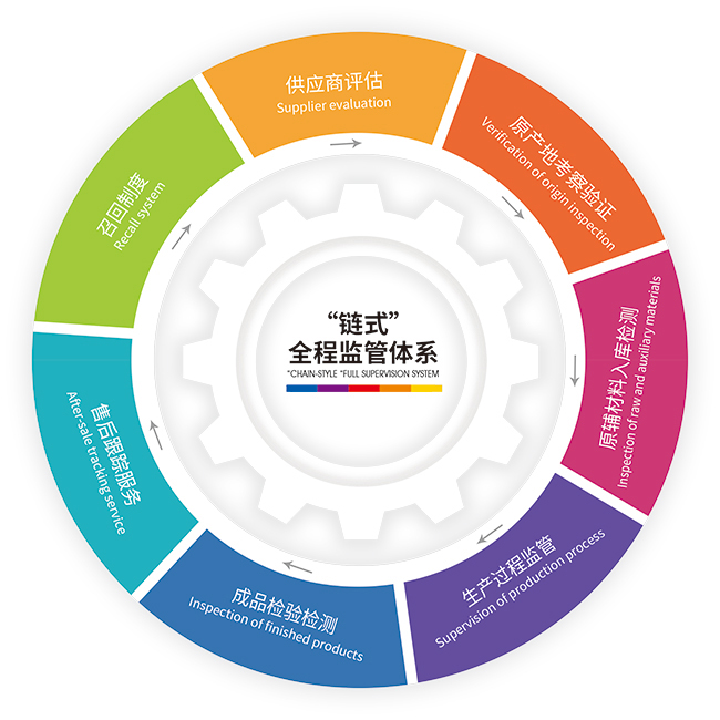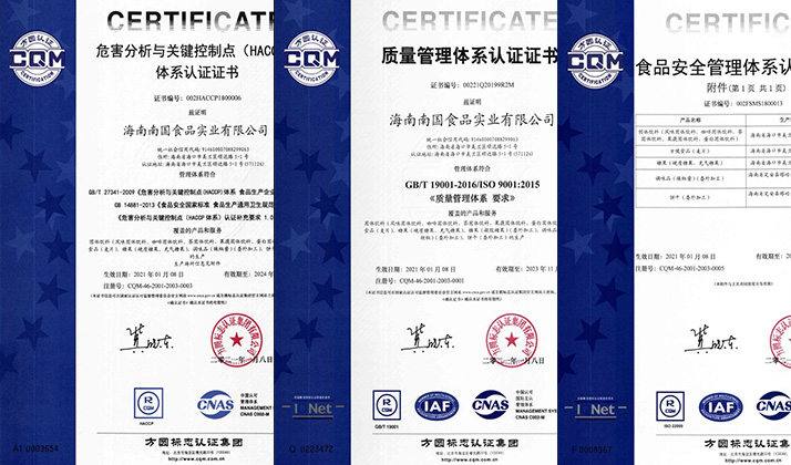 公司获得认证的管理体系有ISO9001质量管理体系、ISO22000食品安全管理体系、HACCP关键控制点与危害分析体系,从原辅料入厂、生产过程控制到产品出厂,整个过程应用管理体系进行管理,建立并实施各项制度文件,有力地保障了产品的质量安全。公司还获得食品出口资质,通过清真食品认证。