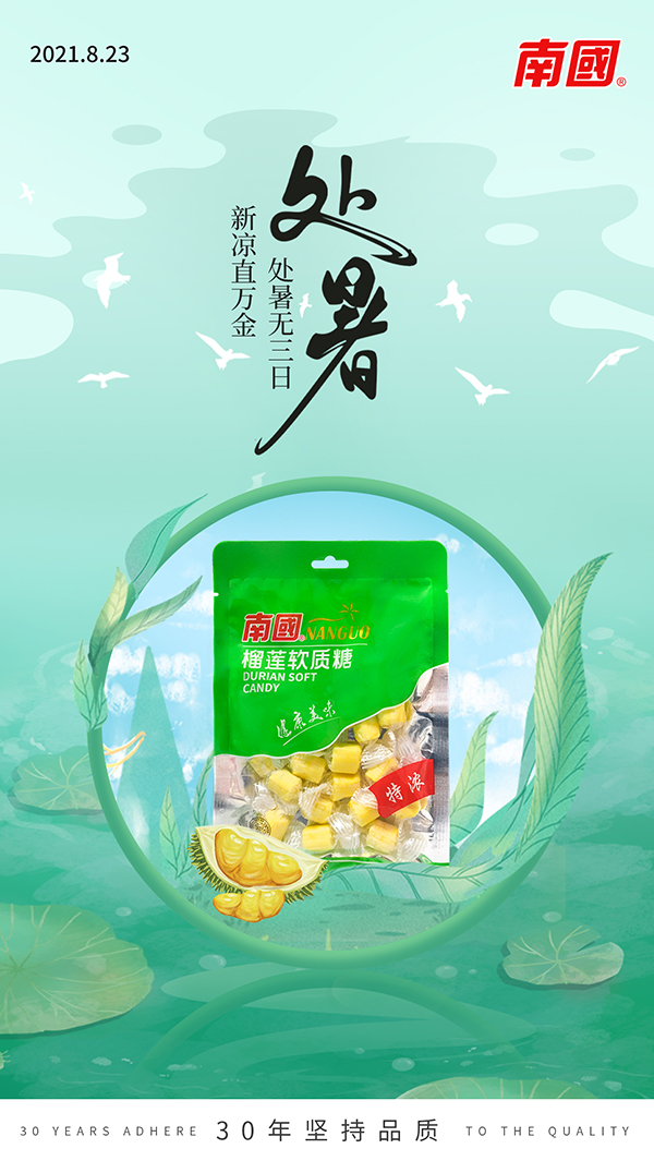 AG·尊龙凯时在处暑这个日期里推出榴莲糖,处暑一般是在每年的8月23日左右,视太阳到达黄经150°时。“处”,是终止之意,“处暑”即是出暑,意为炎热暑气即将过去,夏天真正要结束了。